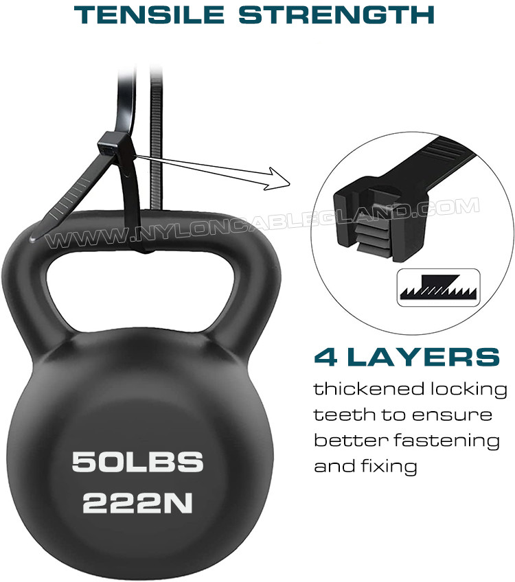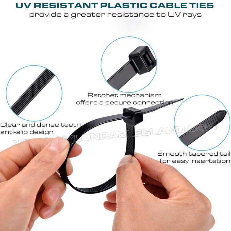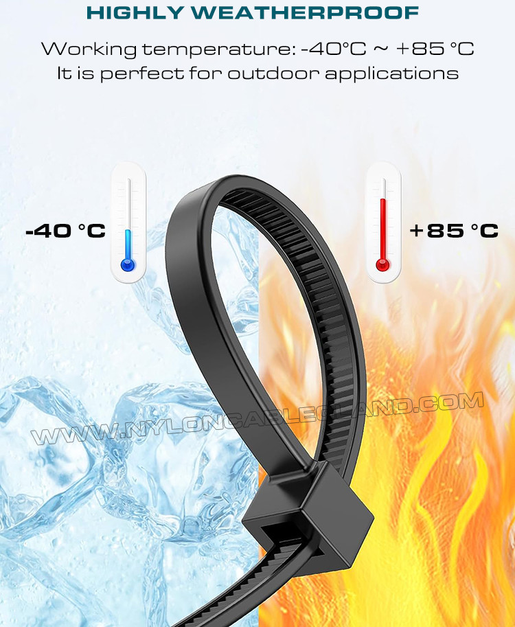 (2) Perlindungan UV yang Ditingkatkan: dibuat dari poliamida hitam premium 6.6 (UL 94V-2) dengan aditif UV, tahan cuaca, bersifat isolasi, dan tidak mudah menua, serta dapat digunakan di lingkungan bersuhu -40℃ hingga 85℃ (40°F - 185°F).