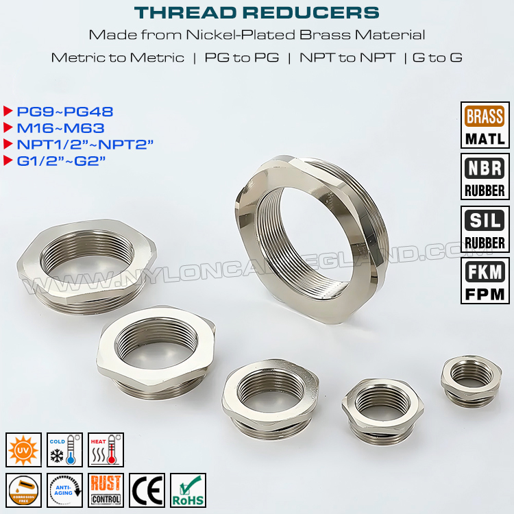 Terbuat dari kuningan atau baja tahan karat 304, 316 atau 316L, mereka adalah fitting standar baru yang digunakan untuk mengurangi, memperbesar atau menyesuaikan ukuran ulir, mereka dirancang dengan tipe bulat atau heksagonal dan tersedia dalam pilihan ukuran standar. Tambahkan ulir berukuran sama atau lebih kecil ke lubang celah, sesuaikan lubang berulir untuk ukuran atau sistem unit yang berbeda, mereka menyediakan metode sambungan yang mudah dan andal antara kelenjar dan ulir yang lebih kecil.
