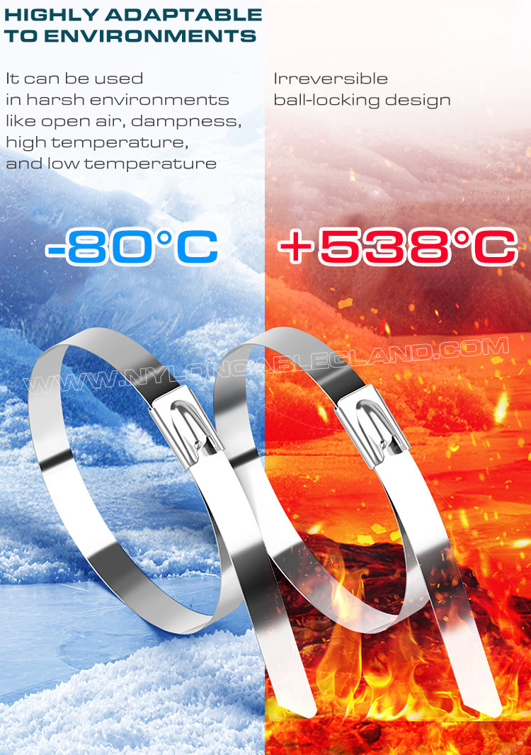 (3) Tahan lama & panas - dibandingkan dengan pengikat kabel plastik biasa, pengikat kabel baja tahan karat bersifat anti-oksidasi, anti-ultraviolet, kokoh dan tahan lama, memiliki ketahanan korosi, karat, cuaca, dan kimia yang lebih baik, serta dapat memberikan perlindungan yang baik di lingkungan korosif.