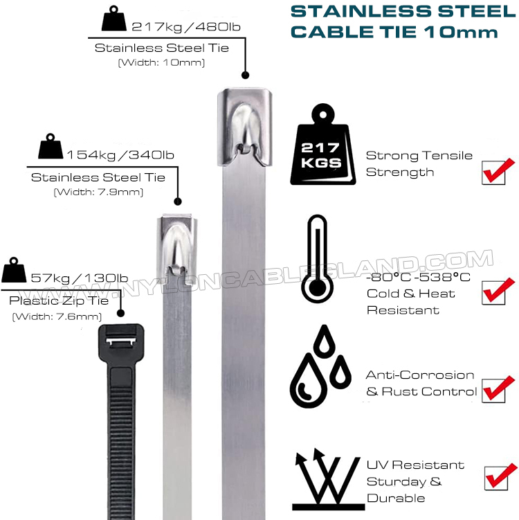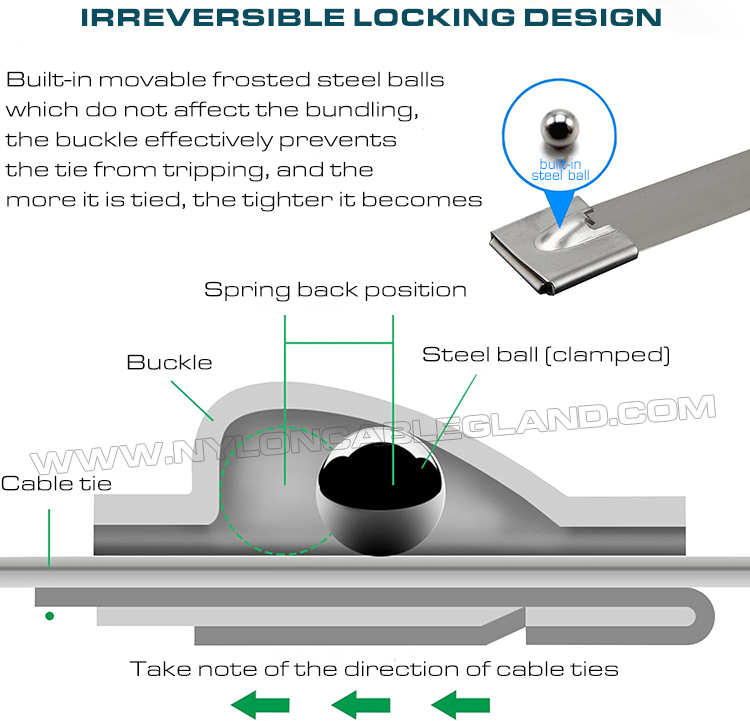 Pengikat kabel baja tahan karat, juga dikenal sebagai pengikat kabel logam, adalah jenis tali pengikat yang terbuat dari baja tahan karat berkualitas tinggi. Jenis yang paling umum adalah pengikat kabel baja tahan karat dengan mekanisme pengunci bola, dengan kepala bola yang dirancang dengan cerdas sehingga memudahkan pengikatan tanpa alat.